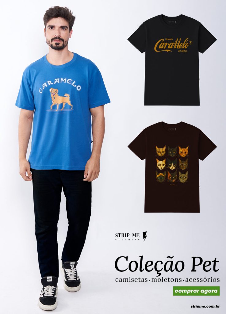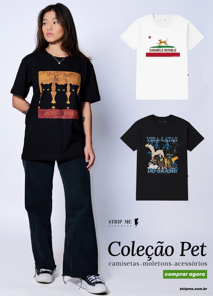 Essas e outras estampas fazem parte da coleção de camisetas pet da Strip Me, criada para mostrar que estilo, humor e amor pelos animais podem (e devem) andar juntos, e sem coleira! A gente morre de orgulho do nosso vira-lata caramelo, mas também dos gatinhos, da capivara, da onça-pintada… todos eles são inspiração pra criar camisetas originais e super estilosas.