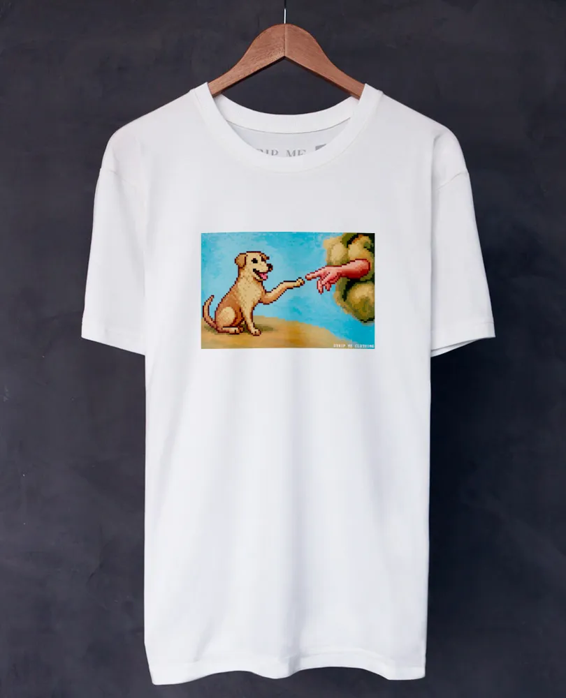 Não dá pra negar que é mais fácil gostar de cachorro do que de gente. Nessa estampa incrível, isso fica evidente: até Deus, na Criação, preferia um doguinho caramelo ali no lugar do Adão.