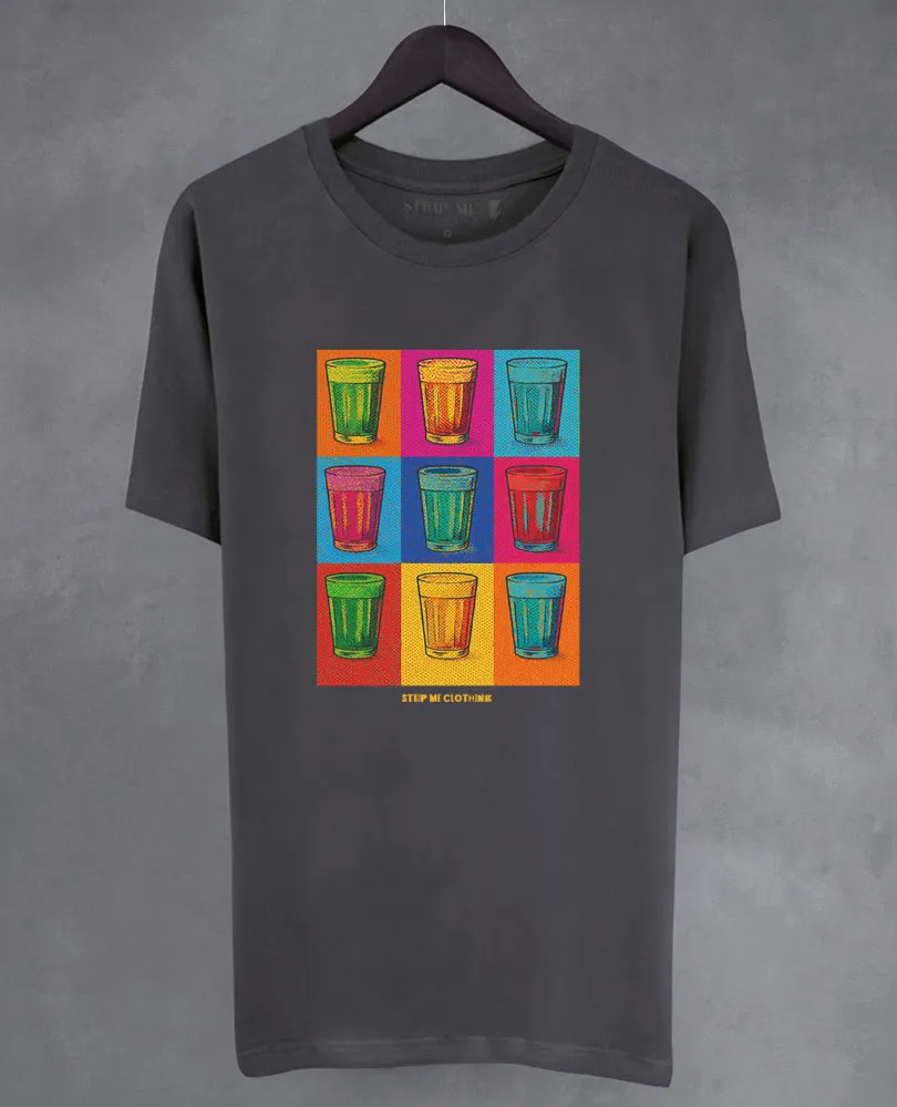 Poucas coisas representam tão bem o Brasil quanto o copo americano. Ele atravessa classes, esquinas e décadas: serve café, água, caipirinha, cerveja gelada e até o tão nosso c* de burro. Além disso, entrega muita história de boteco. Nesta camiseta de brasilidades, nosso ícone democrático ganha tratamento pop: cores vibrantes, repetição à la Pop Art e aquela mistura perfeita entre arte, cotidiano e identidade nacional. Uma estampa que transforma o simples em cult, do jeito que só a Strip Me sabe fazer.