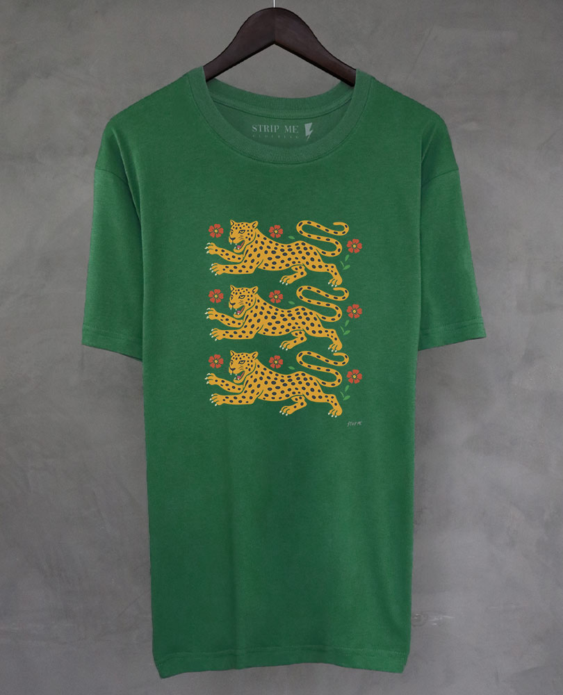 A onça pintada é um dos animais mais emblemáticos do Brasil, símbolo de força, beleza e da nossa rica biodiversidade. Agora imagine multiplicar essa imponência em três, cercada por flores tropicais e transformada em arte gráfica vibrante. O resultado é esta camiseta de brasilidades que celebra a fauna brasileira com leveza e potência, reunindo natureza, cor e identidade nacional num só olhar.